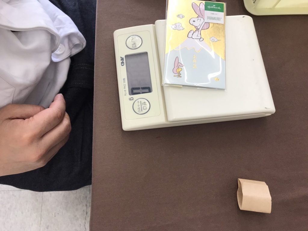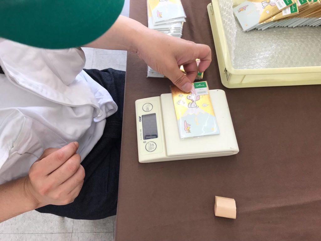 本日の作業これも大事な仕事です。3枚封入した完成品の数量間違いがないか、計量して確認してもらっています。どんな作業でも、間違えても大丈夫です。間違いに気がつけるようなやり方をしています。