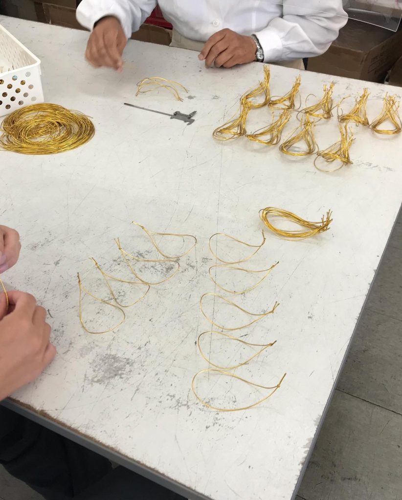 本日の作業は、久しぶりに金の紐結びを行いました。同じ輪の大きさになるように、結び目を調節するのが難しいです。長さも同じになるように、1巻から切って使っていますので苦労しています。