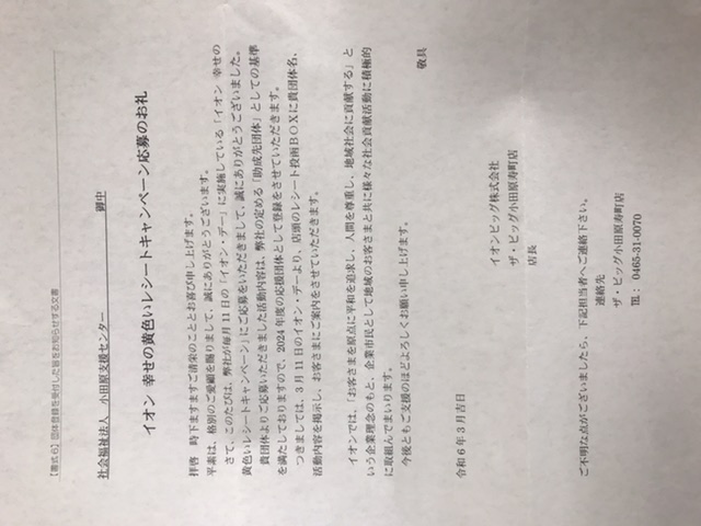 毎月11日の『イオン・デー』に、ザ・ビッグ小田原寿町店で買い物をして、レシートを投函すると支援センターにもその金額の1%が還元されます。