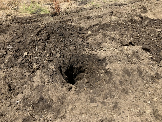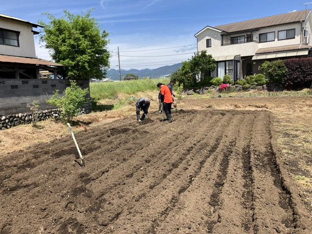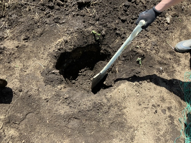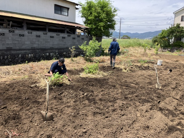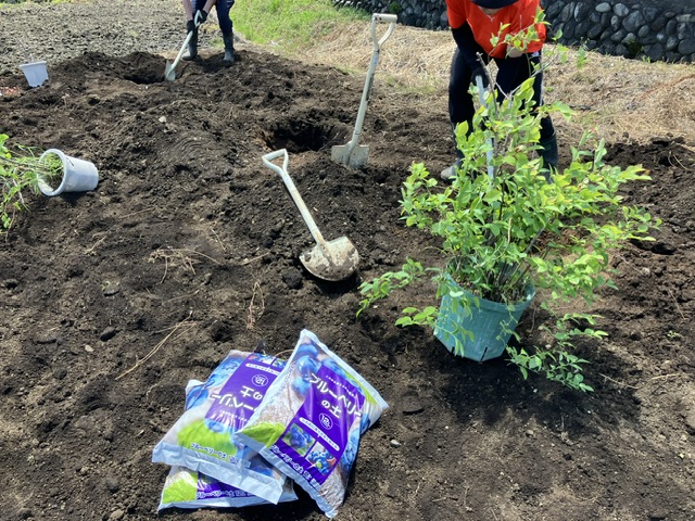 穴を掘り肥料と酸性の土を入れ、土壌を作ってから埋め戻し、最後に水をあげて完成しました。
