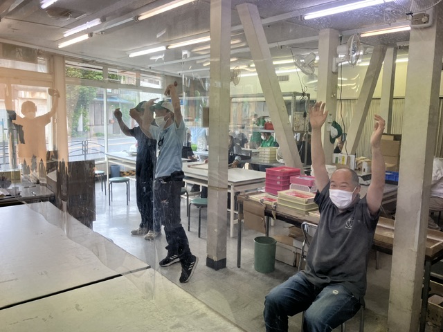 昼食後、午後の作業が始まる前にラジオ体操やってます。