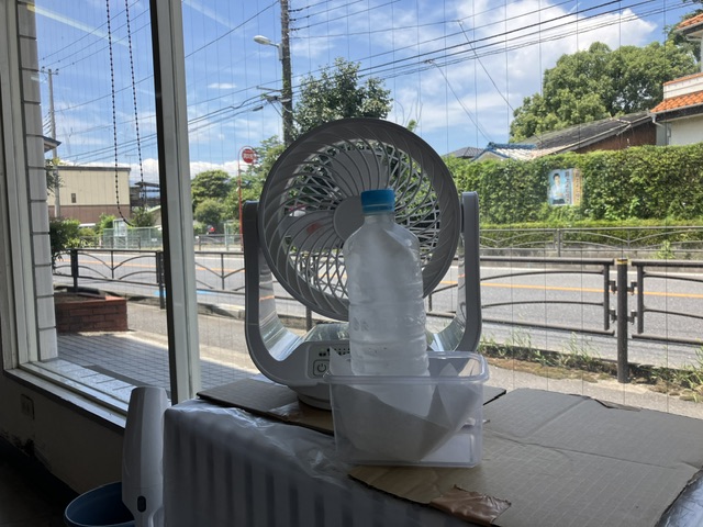暑い日が続きます、ペットボトルを凍らせてサーキュレーターの前に置いて、涼をとっています。少しの工夫で快適になります。みなさんも喜んでくれています。