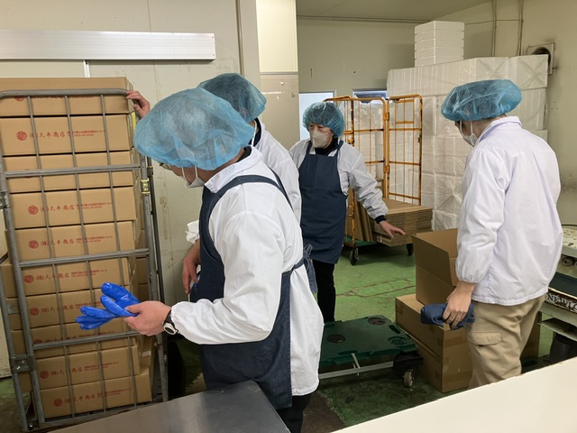水、金曜日に大半商店様の倉庫に赴き、干物の袋詰め作業を行っています。完成品を冷凍庫に運ぶのは、とっても熱い気持ちがないと心が寒さで折れていまいそうです。
