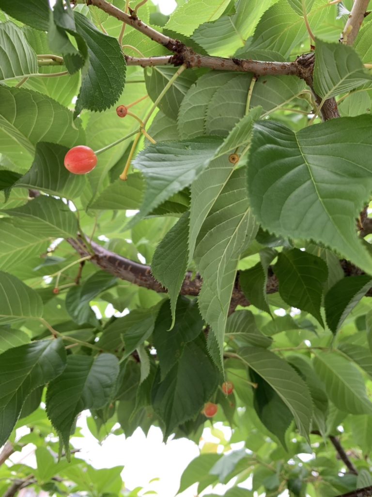 支援センター本部のオカメ桜にさくらんぼが実っています。季節が動いているのを感じますね。