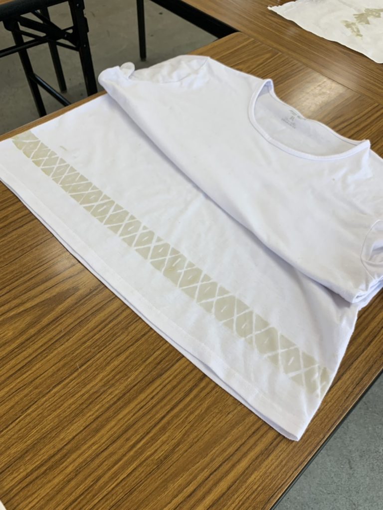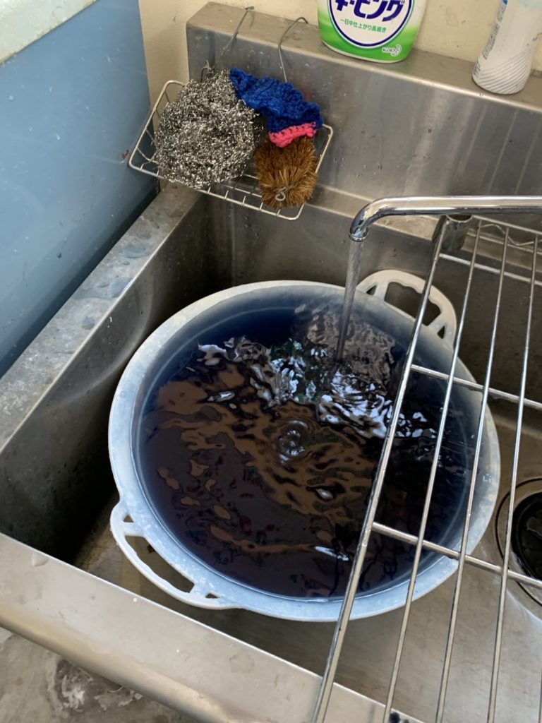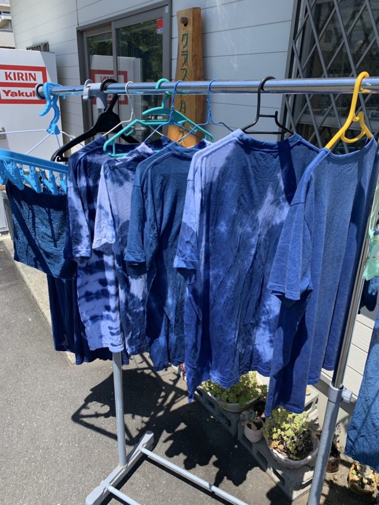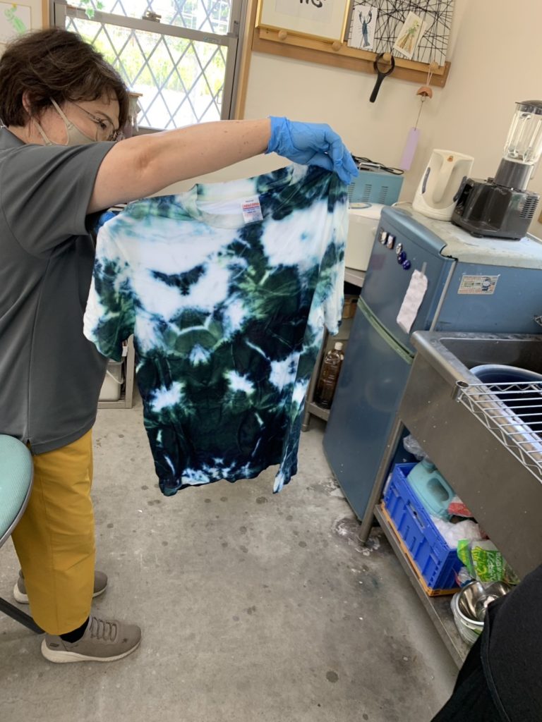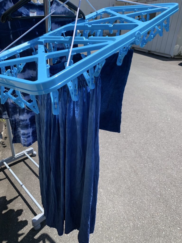 のりで型を抜いて、のりを塗ったところは染まらないのです。藍につけて染めて行きます。空気に触れると藍のきれいな色が出てきます。今日はTシャツ、手ぬぐい、靴下、スカートなどを仕上げていきます。夏らしくさわやかな色合いがいいですね。支援ブルーです。