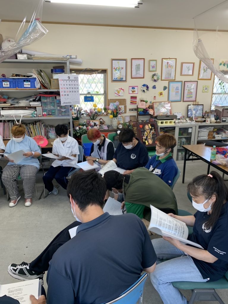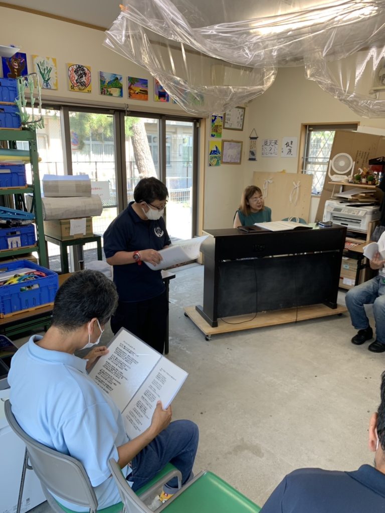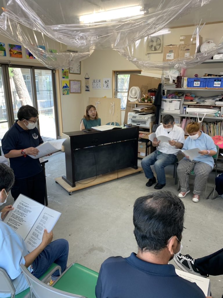 クラフトハウスコーラスグループです。月に一回、音楽ボランティアの佐藤則子先生に来ていただいて、利用者の皆様からのリクエストに応えながら、楽しい時間を過ごしています。皆さんリラックスしてそれぞれの好きな歌を歌っています。