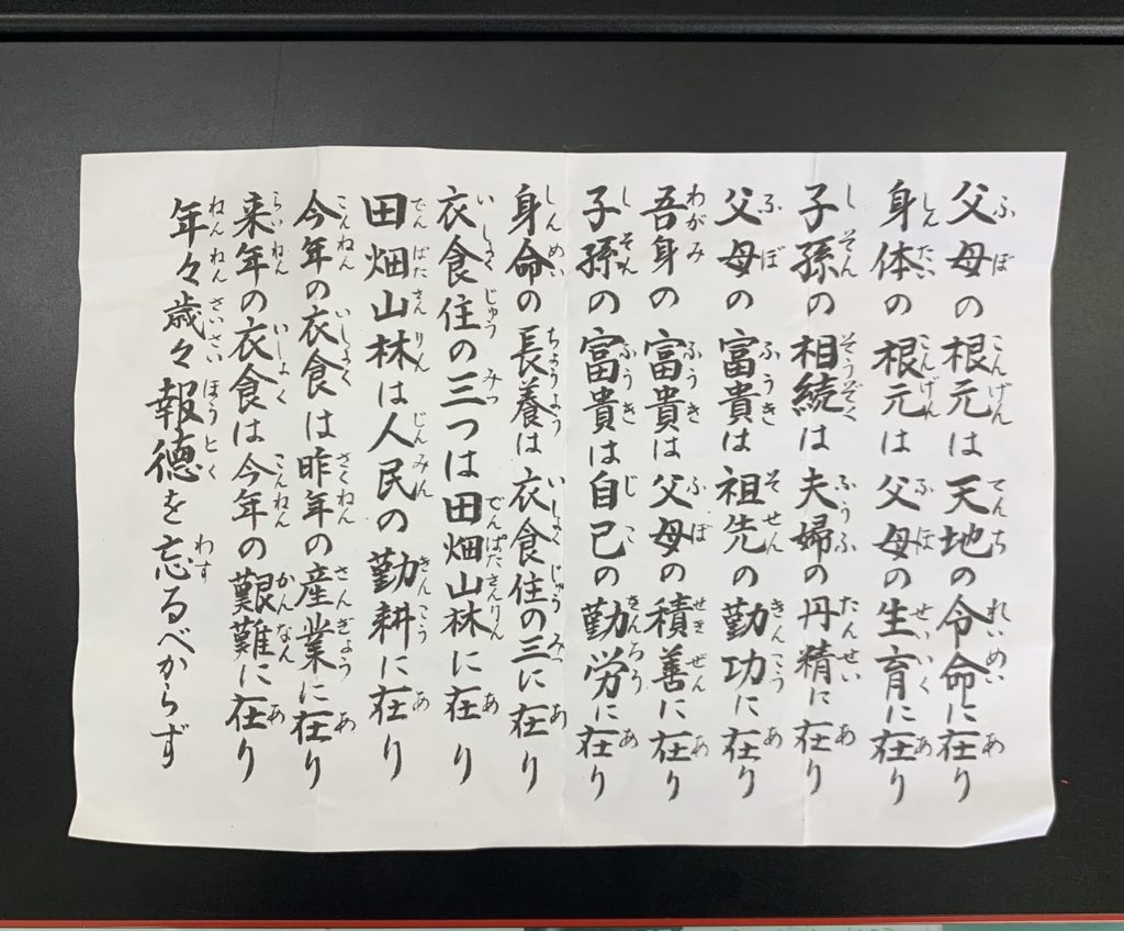 秋の実りに感謝して、報徳訓を改めて読み返して、支援センターの安全を祈願してきました。二宮金次郎先生の教えに沿って生活していきましょう。
