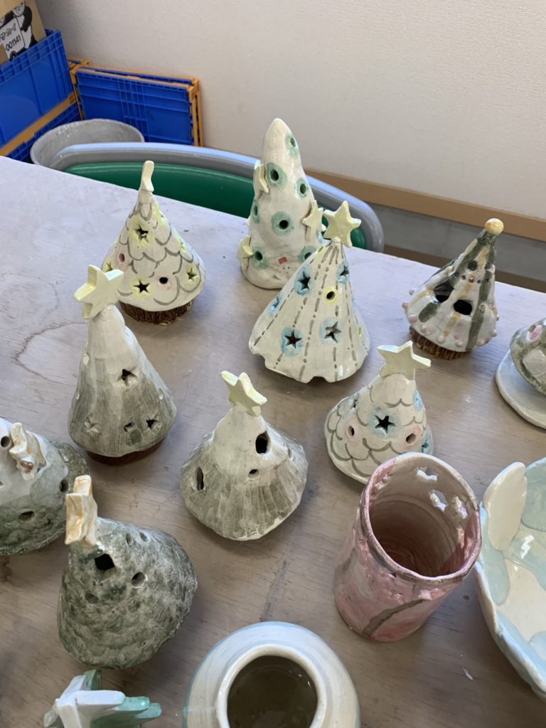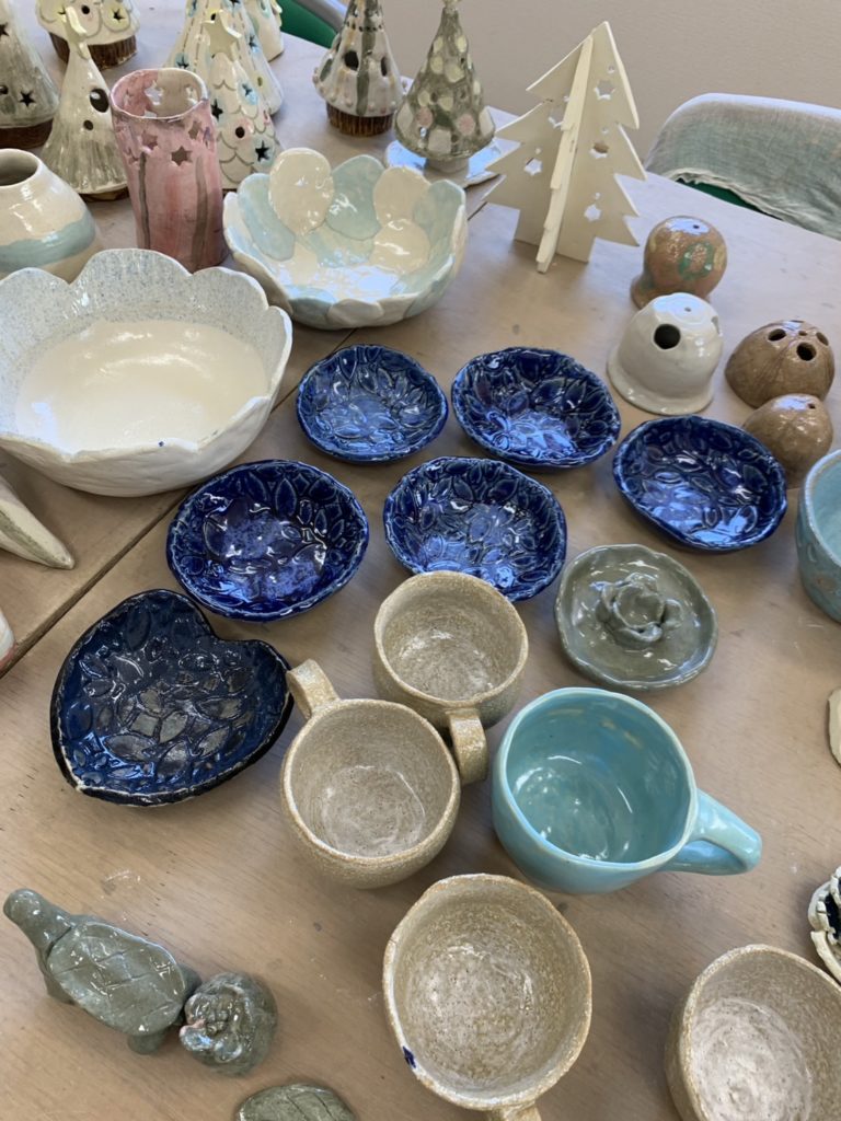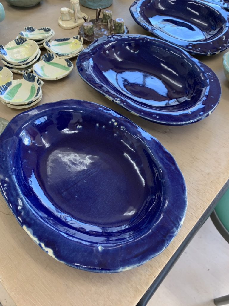 陶芸グループ、東窯作品展に向けての本焼きの一回目が終わりました支援ブルーが鮮やかな出来栄えです。その他にも楽しい作品に仕上がっています。