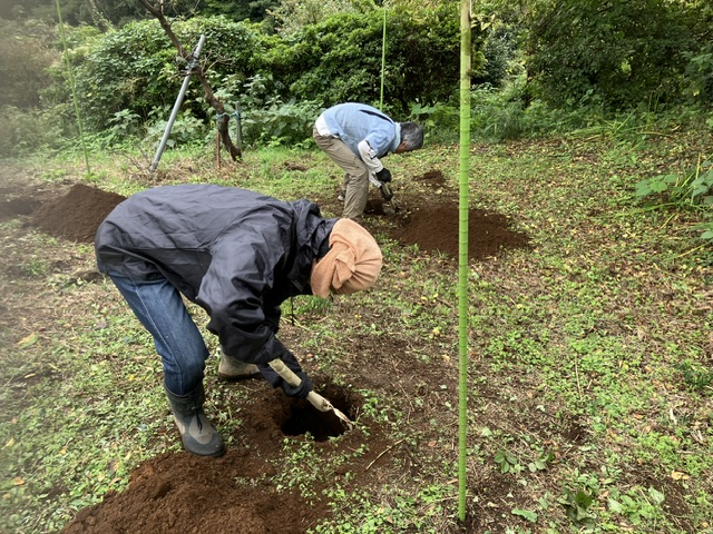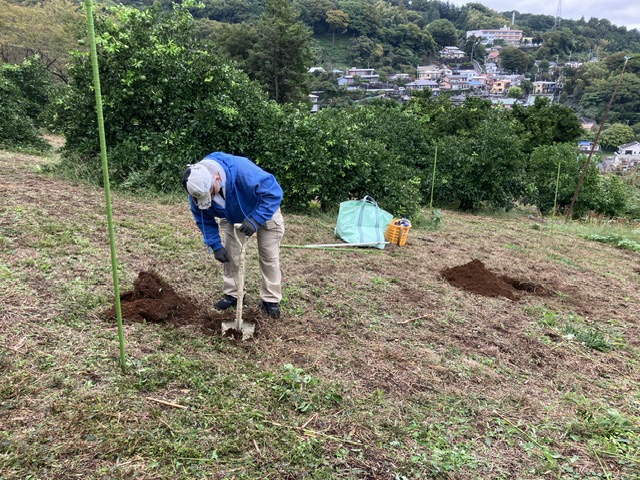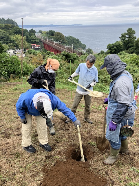 昨日、根府川あるみかん畑のお手伝いに行きました。スコップを使って穴を掘り、苗木を植える作業を行い、みんな説明を聞きながら、まさに手探りで作業を進めていました。