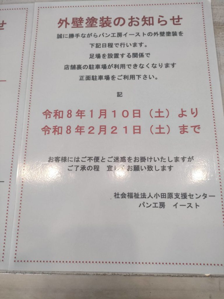 また、来週から2/21まで外壁塗装工事をするので店舗裏の駐車場が利用できなくなります。
