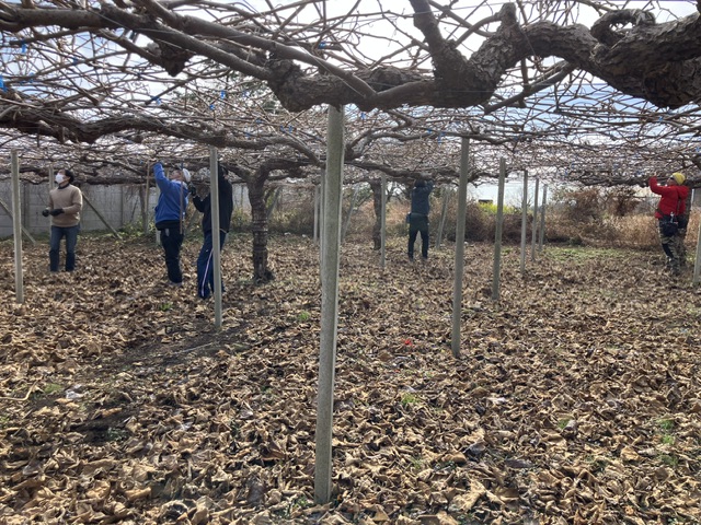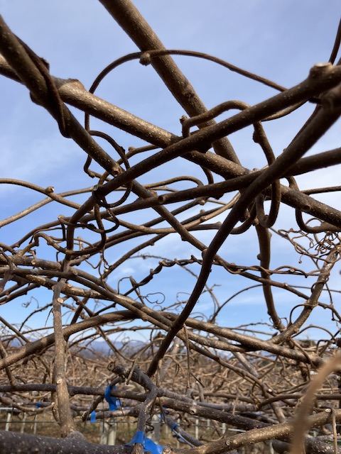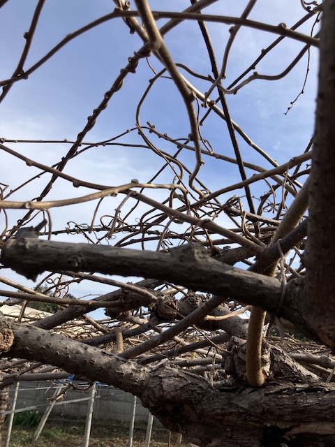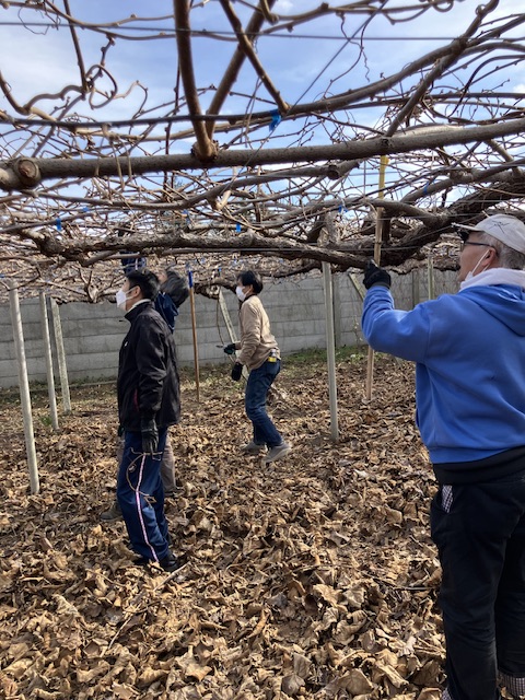 本日は、キュウイフルーツの枝の剪定作業をしました。クルリと巻きついている枝を切り、サッパリしました。上を向いての作業で、首が疲れたようです、おつかれさまでした。