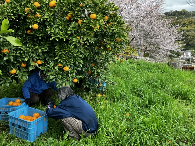 雨の合間に甘夏回収作業