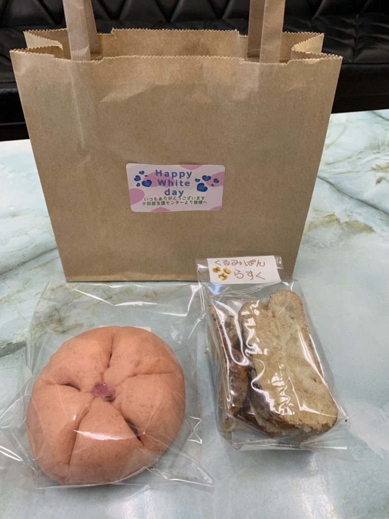 パン工房イーストから支援センターの皆様にホワイトデーのお菓子をお配りします。